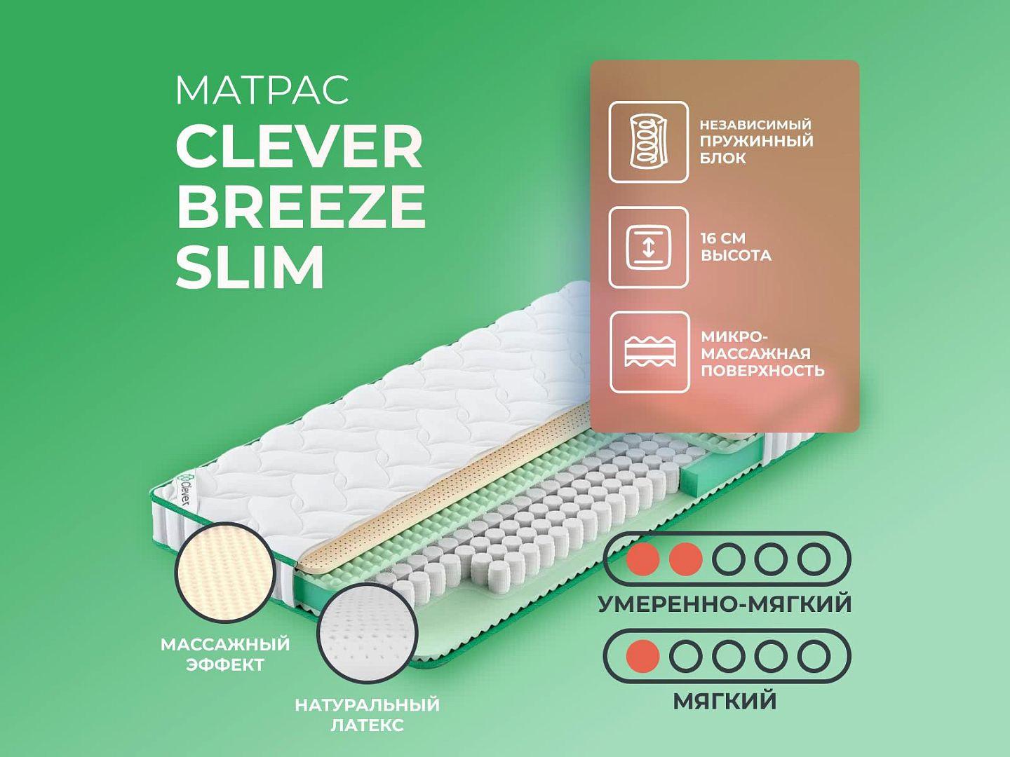 Фабрика Clever получила заслуженную репутацию, благодаря применению новых технологий и безупречному соблюдению стандартов качества. Clever Breeze Slim — образец продукта с лучшими характеристиками и доступной ценой, матрас создан из дышащих тканей, с эффектом вентиляции.