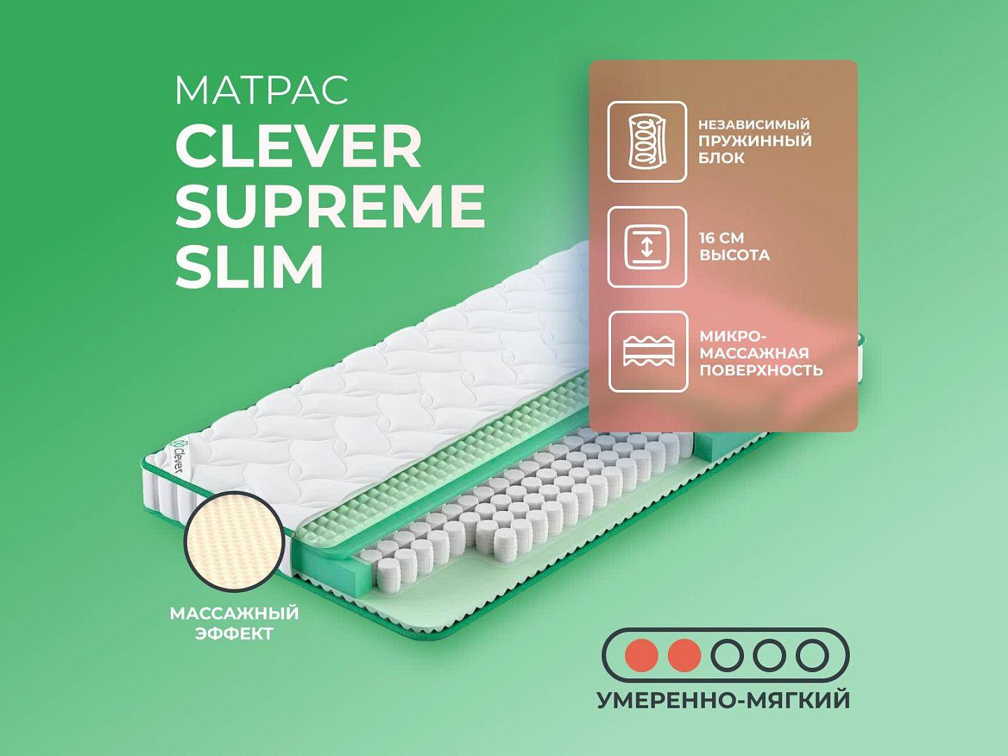 Фабрика Clever получила заслуженную репутацию, благодаря применению новых технологий и безупречному соблюдению стандартов качества. Clever Supreme Slim — образец продукта с лучшими характеристиками и доступной ценой, матрас создан из дышащих тканей, с эффектом вентиляции.